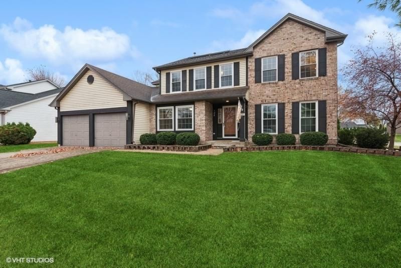 Fantastic location on a corner lot backing to open space park behind the home. Customized Kitchen SS apps, granite counters. Vaulted ceilings and fireplace in family room. Sunroom off the kitchen with skylights. First floor den. Updated baths. Primary bedroom with vaulted ceilings enjoys large his/hers WIC closets and updated bath. Finished basement with entertainment area, full bathroom, bedroom, and beautiful bar. Plus losts of finished storage and utility sink. Tiled entry and living and dining room Improvements incl: roof & siding(2013), paver driveway with wrap around to backyard. All new interior windows with warranty. New hot water heater. New garage door openers. Leased solar panel to transfer with low utility costs. Above ground pool including supplies with storage building as is. Fenced yard backing to an open space. Wine cooler or dishwasher will give credit for replacement. Great home for everyone in your life!